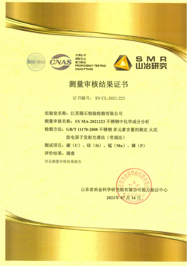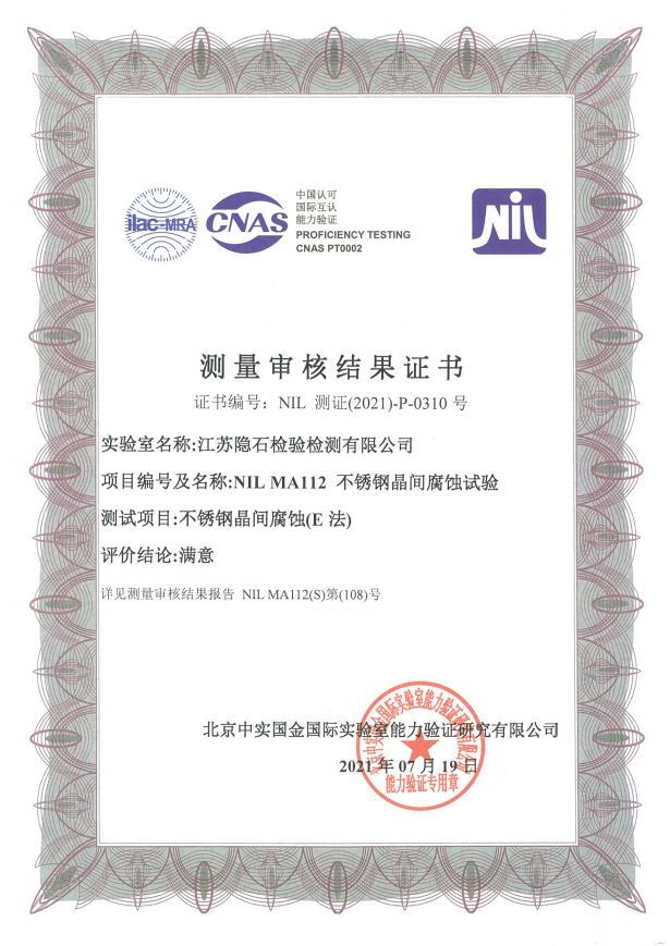 近日,江蘇隱石檢驗檢測有限公司取得了由北京中實國金國際實驗室能力驗證研究有限公司(國內(nèi)具有能力驗證提供者資格的第三方獨立法人機構(gòu),簡稱“中實國金”)頒發(fā)的不銹鋼晶間腐蝕檢測審核合格證書。由于測量審核是中國合格評定國家認可委員會(CNAS)判斷國家認可實驗室能力的重要技術依據(jù),隱石檢測根據(jù)認可要求參加了中實國金組織的測量審核,檢測中心的技術人員通過對中實國金發(fā)送的貴金屬盲樣進行認真、細致的檢測分析,得出了檢測結(jié)果,并提交給能力驗證機構(gòu)。中實國金經(jīng)審核評價給出...