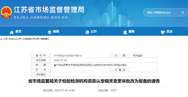 近日,江蘇省市監(jiān)局發(fā)布“關(guān)于檢驗檢測機構(gòu)資質(zhì)認(rèn)定相關(guān)變更審批改為報備的通告”,自2022年7月27日正式執(zhí)行。江蘇省市監(jiān)局將檢驗檢測機構(gòu)申請無需現(xiàn)場確認(rèn)的機構(gòu)法定代表人、最高管理者、技術(shù)負(fù)責(zé)人、授權(quán)簽字人變更,以及無實質(zhì)變化的標(biāo)準(zhǔn)變更審批改為報備。檢驗檢測機構(gòu)須以自我聲明符合資質(zhì)認(rèn)定相關(guān)要求的方式向市監(jiān)局備案。各檢驗檢測機構(gòu):為了深入貫徹“放管服”改革要求,認(rèn)真落實“證照分離”工作部署,進(jìn)一步推進(jìn)檢驗檢測機構(gòu)資質(zhì)認(rèn)定改革,優(yōu)化檢驗檢測機構(gòu)準(zhǔn)入服務(wù),根據(jù)《市...