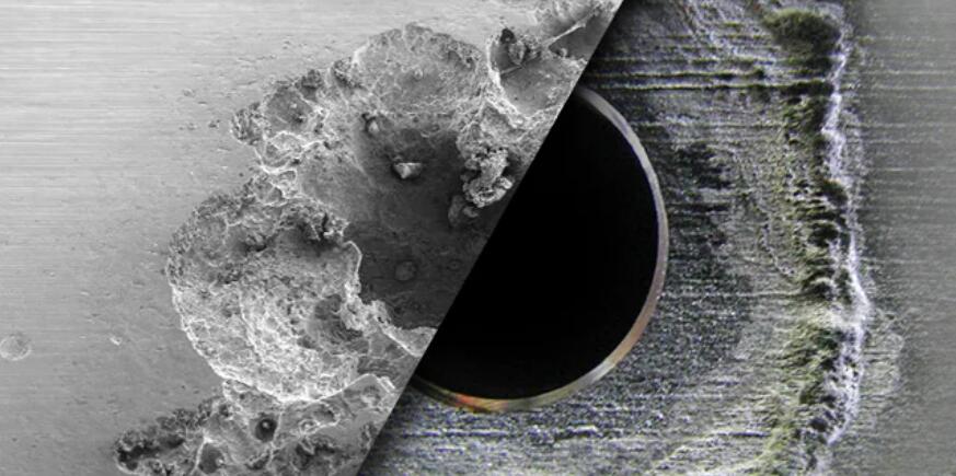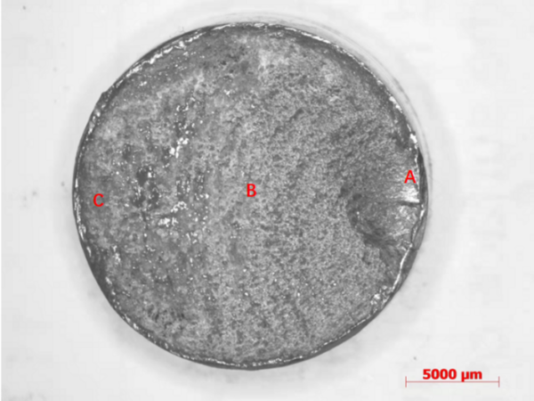 近日隱石檢測接到某公司委托,對機械零件進行斷口分析測試方法:JY/T 010-1996、GB/T 17359-2012圖1為來樣形貌,根據(jù)客戶要求對斷口形貌進行觀測。圖2為斷口體式形貌,宏觀來看,有周期擴展特征,且表面A區(qū)有摩擦特征,說明該區(qū)域斷裂較早,因此推斷從A區(qū)向C區(qū)方向擴展,詳見圖中標注。圖3為斷口A區(qū)形貌,可見邊部有明顯摩擦特征圖4為摩擦區(qū)域放大形貌,摩擦平整,無斷口特征;圖5為A區(qū)非摩擦區(qū)域微觀形貌,主要為撕裂小韌窩,部分區(qū)域有類似疲勞紋的褶痕...